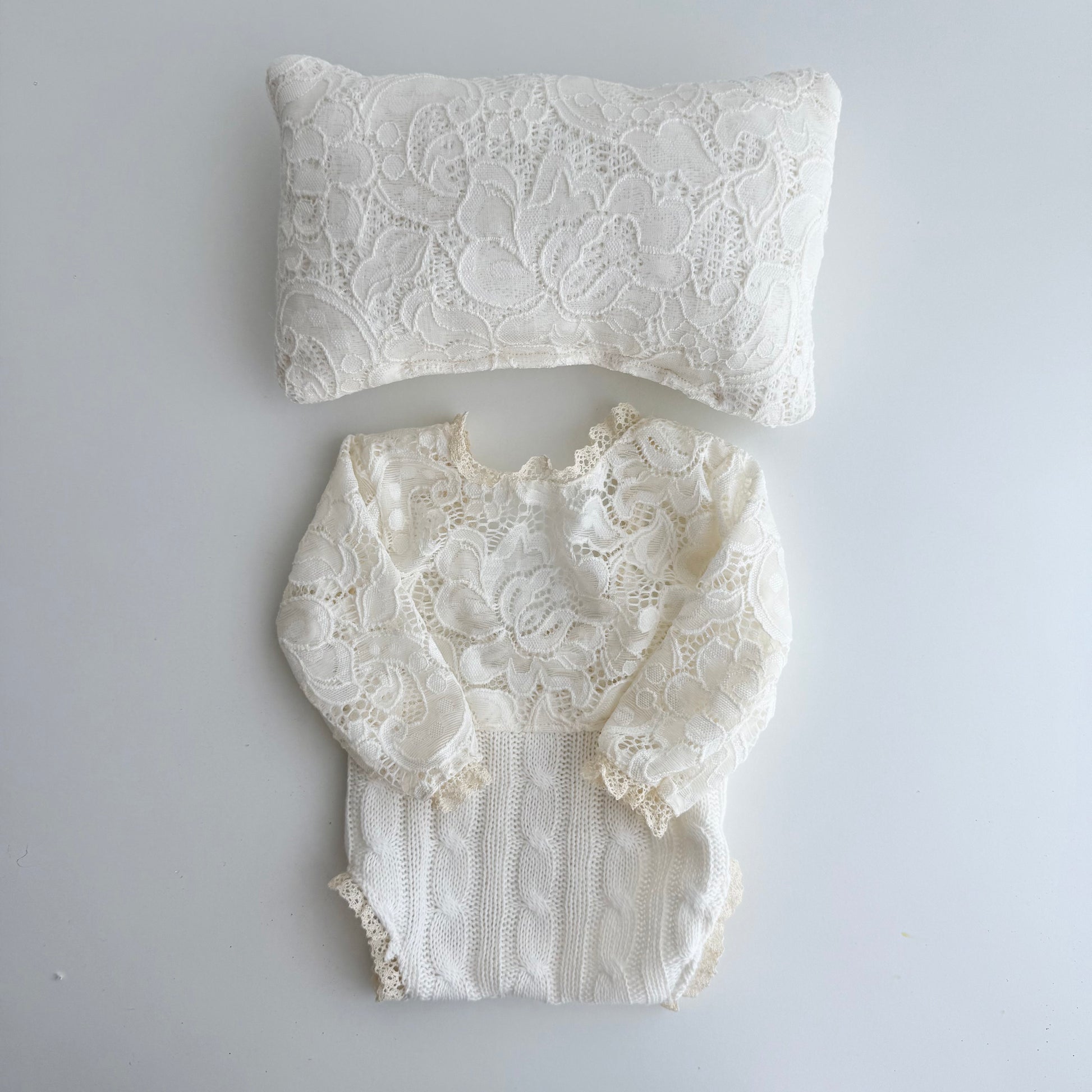 The outfit features a romantic lace top with an intricate floral pattern, adding a light and airy feel that looks stunning on camera. Long sleeves and subtle lace details enhance its classic and refined style. The lower part is made from a soft, textured knit fabric that gently wraps the baby, creating a cozy and harmonious look.