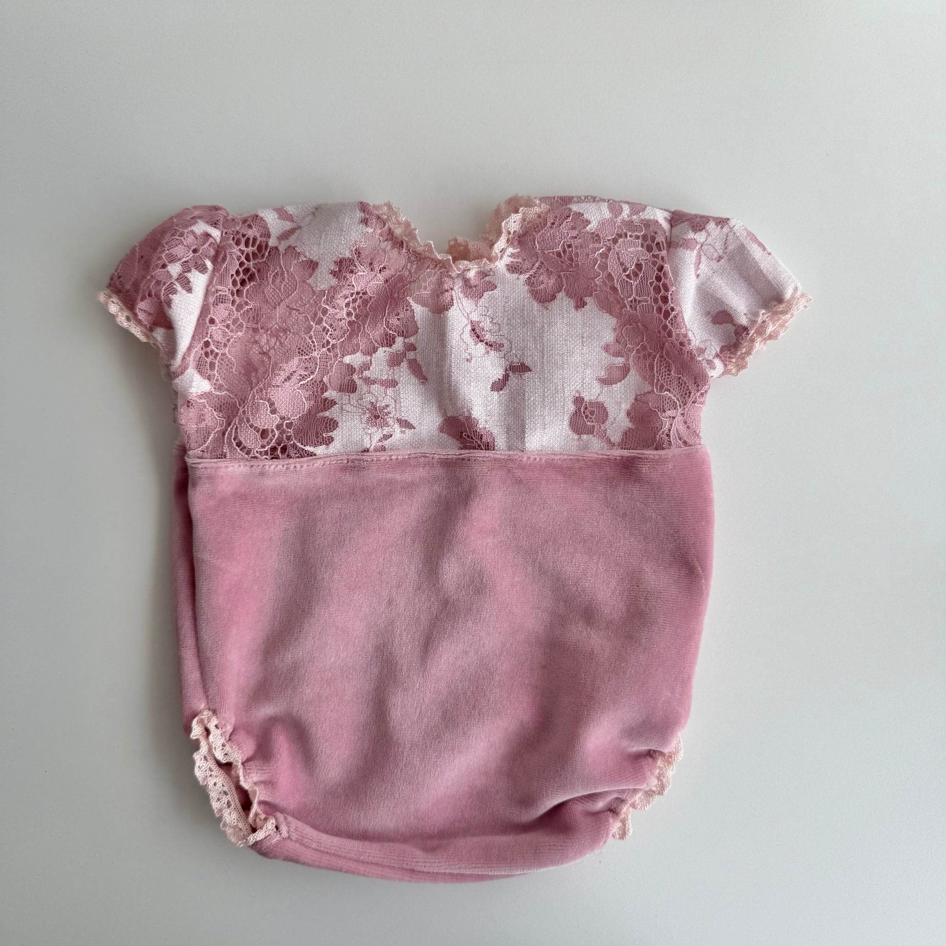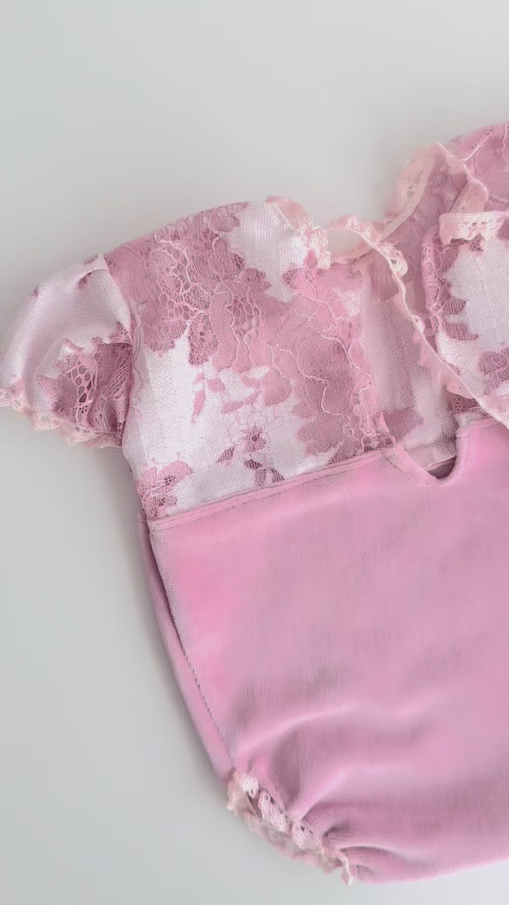 The bodysuit’s top is made from intricate floral lace (100% polyester) that adds a dreamy, delicate texture, while the finishing touch of fine pink cotton lace around the edges creates a subtle, sophisticated detail perfect for newborn sessions.