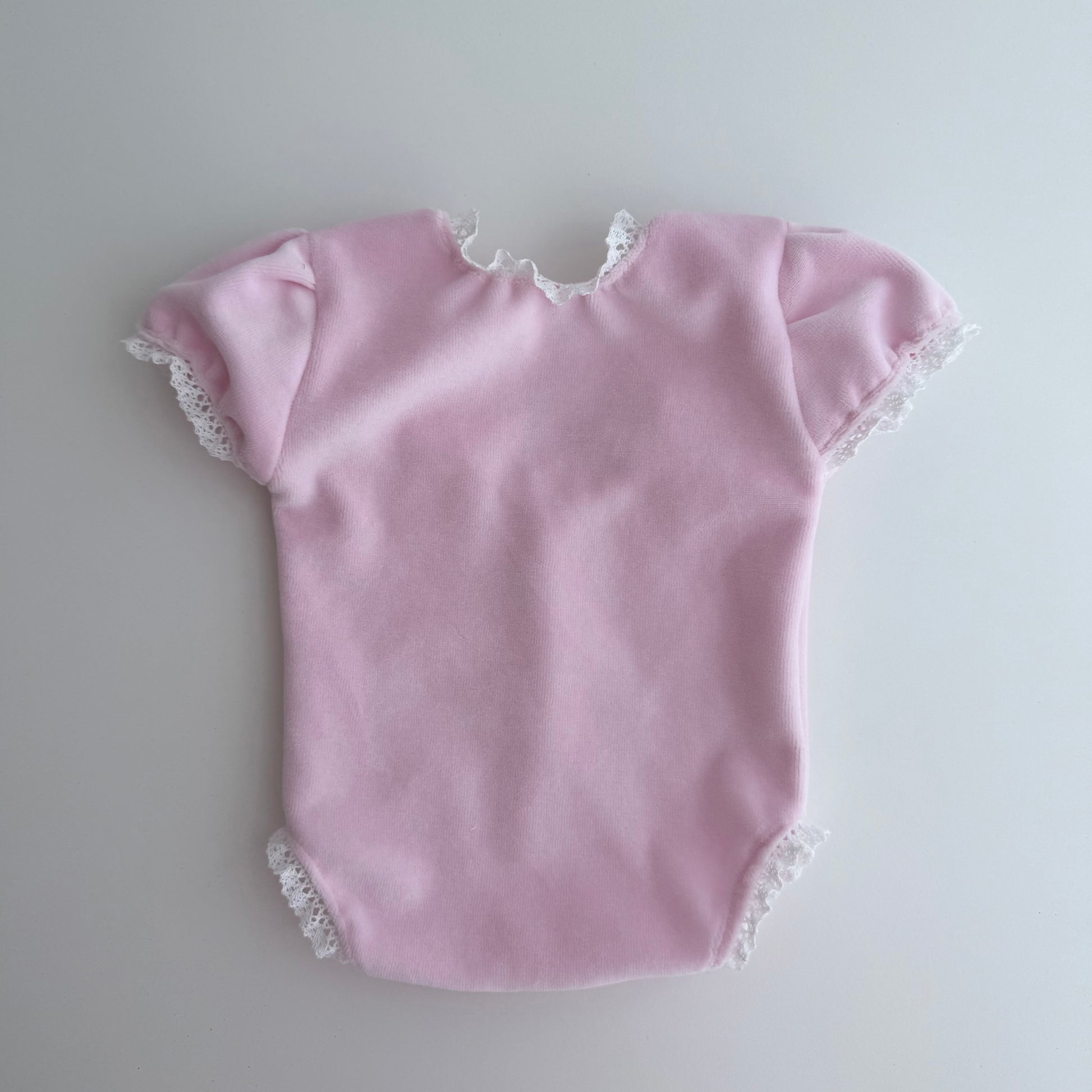 The romper is made from a beautiful pink velvet fabric composed of 71% cotton and 23% polyester, offering a soft texture with a gentle stretch that fits newborns comfortably during sessions.