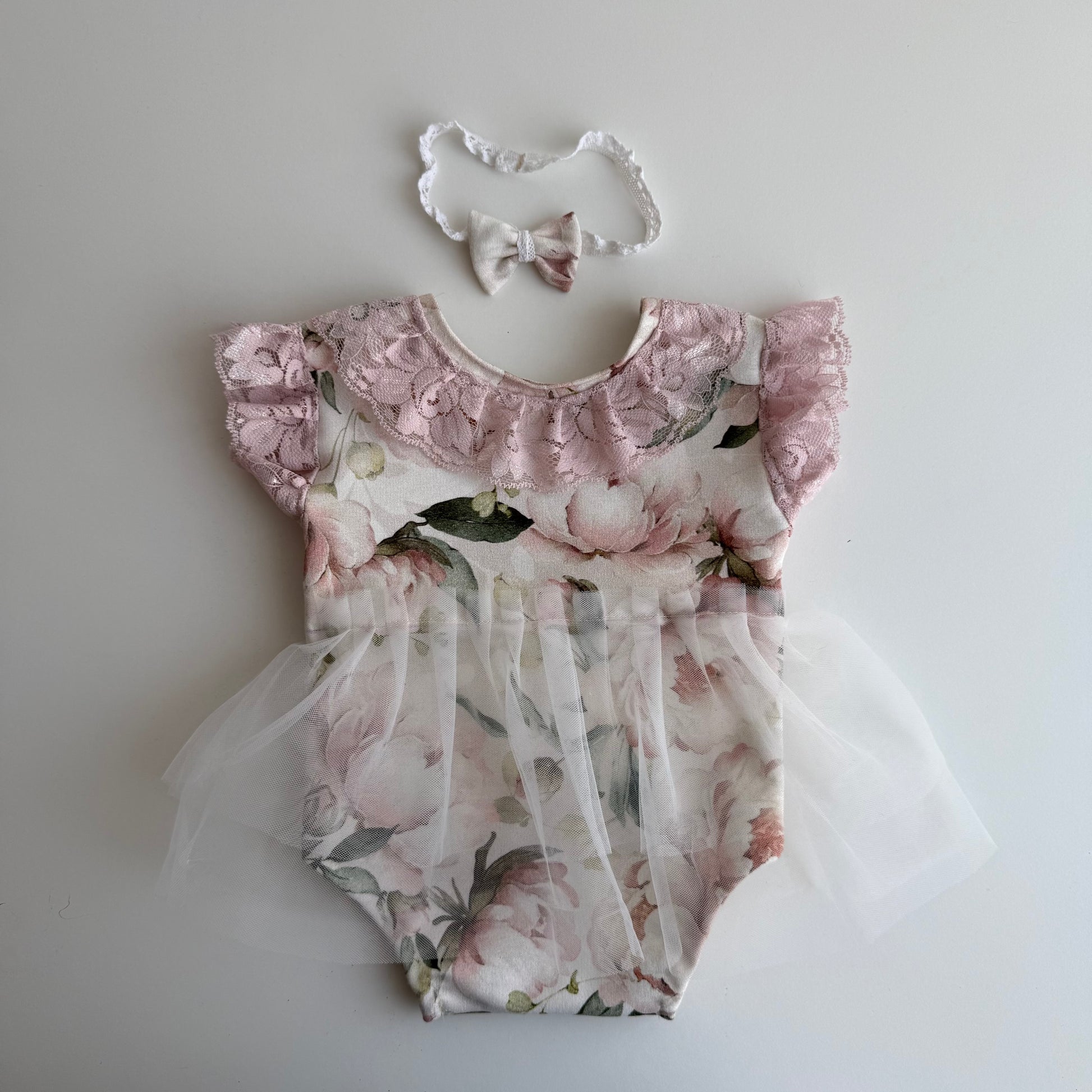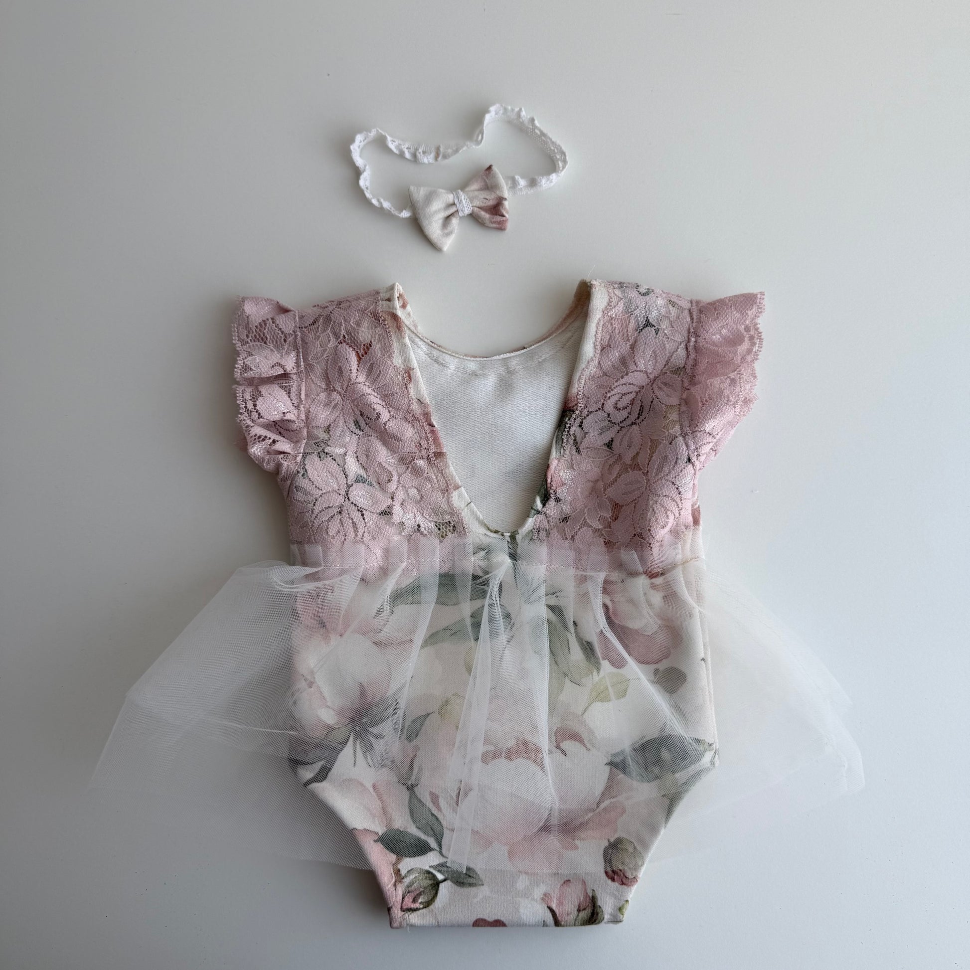 A charming newborn outfit designed as a photography prop for baby girl sessions. This delicate piece combines soft floral fabric with elegant lace and tulle details for a timeless and romantic look.