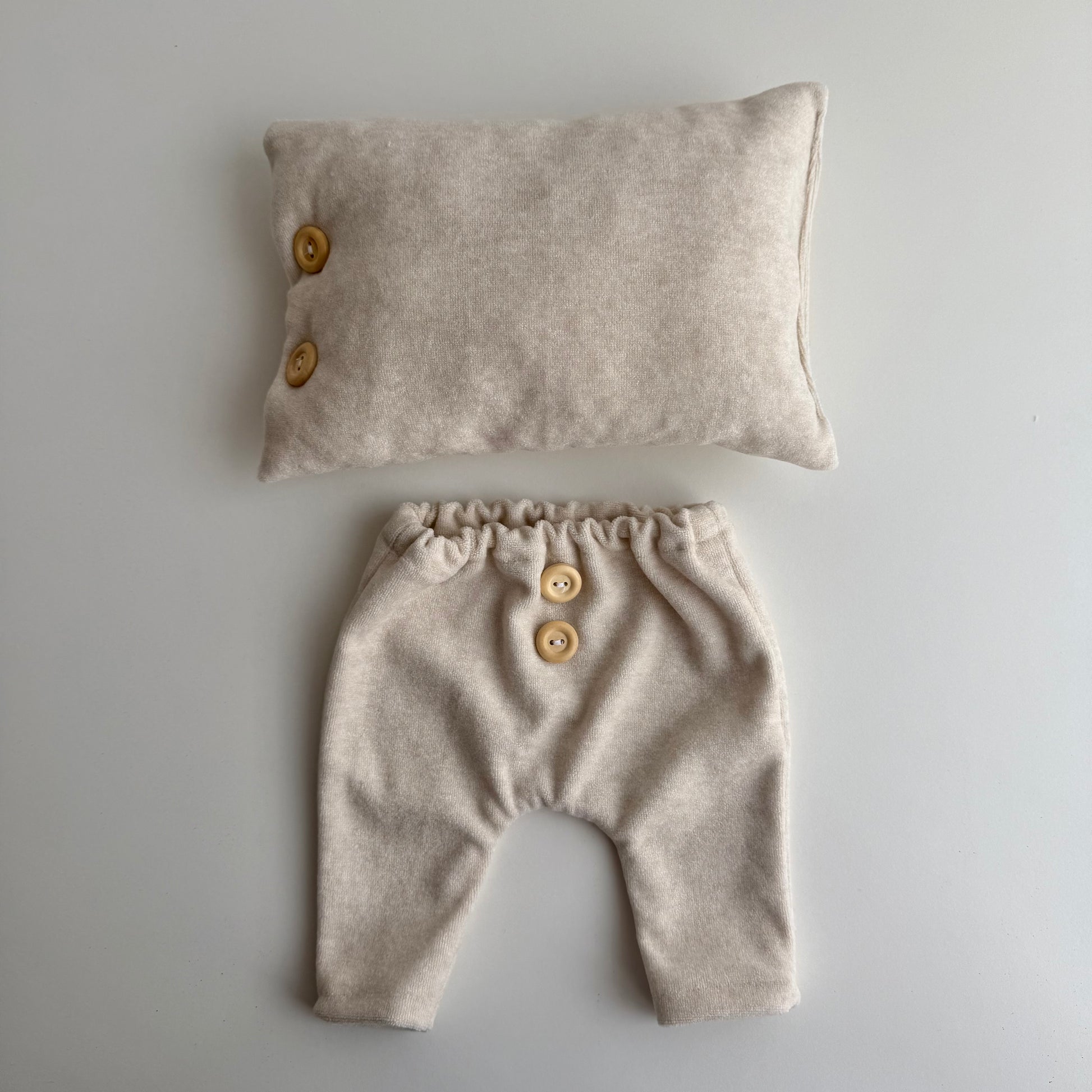 Made from a high-quality knit fabric that is exceptionally soft, stretchy, and gentle on sensitive newborn skin. The elastic waistband ensures a comfortable fit without pressure, while decorative wooden buttons add a subtle, charming detail. The pillow provides gentle support and completes the styled composition of the set.