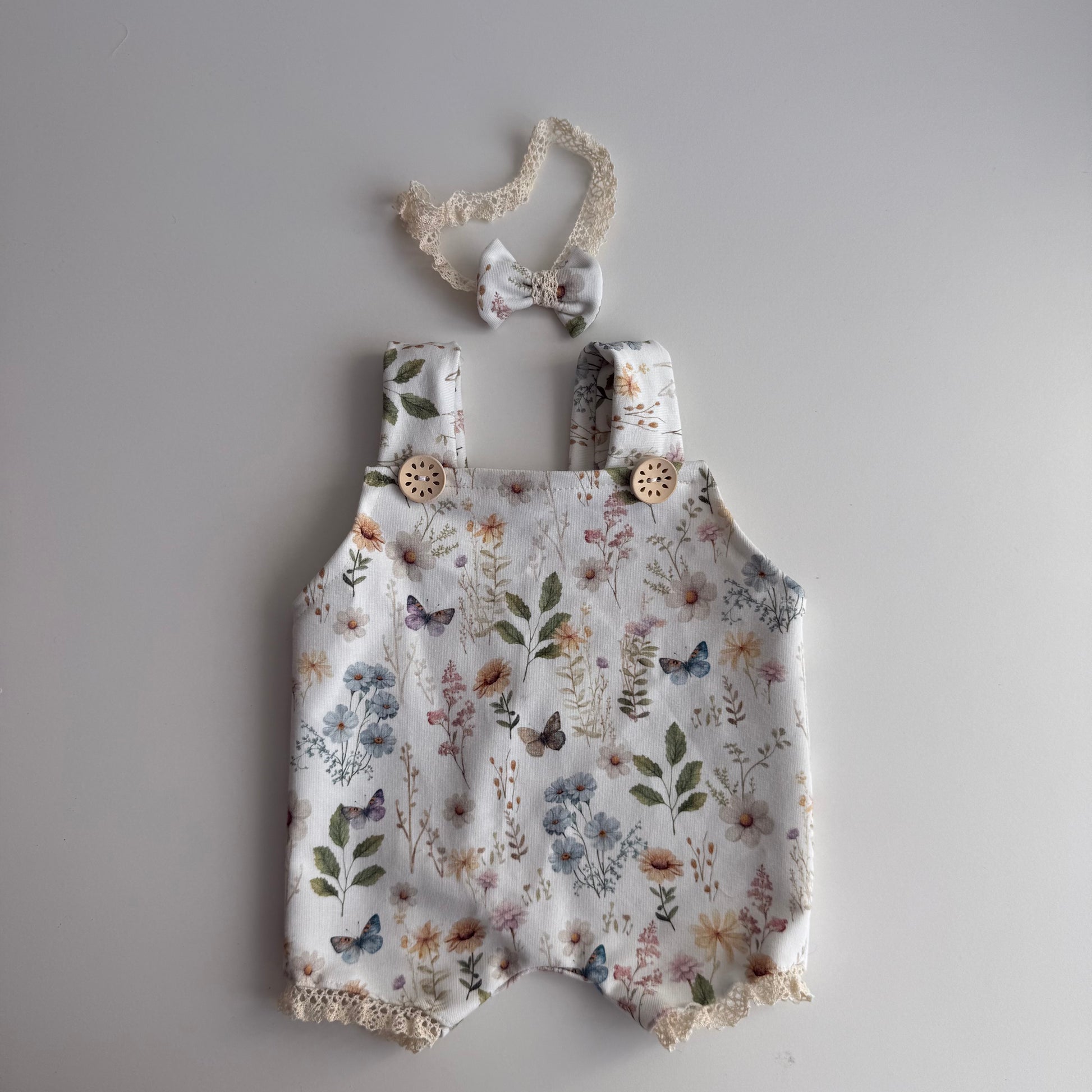 Handmade newborn set including a floral romper with butterfly details and a matching bow headband, designed for newborn photography sessions.