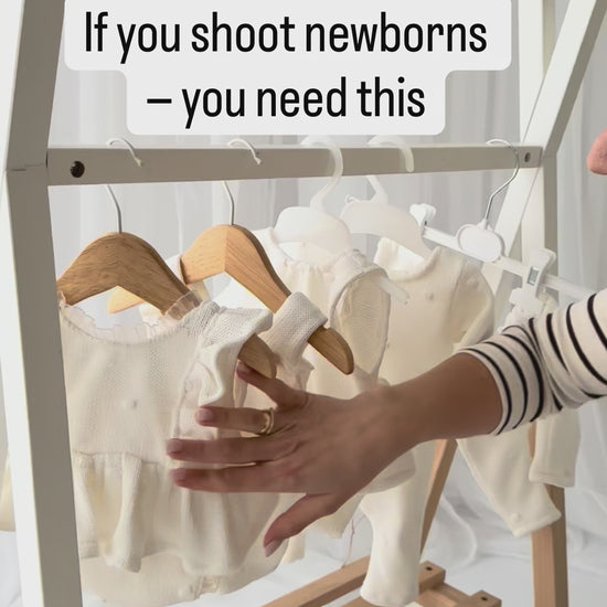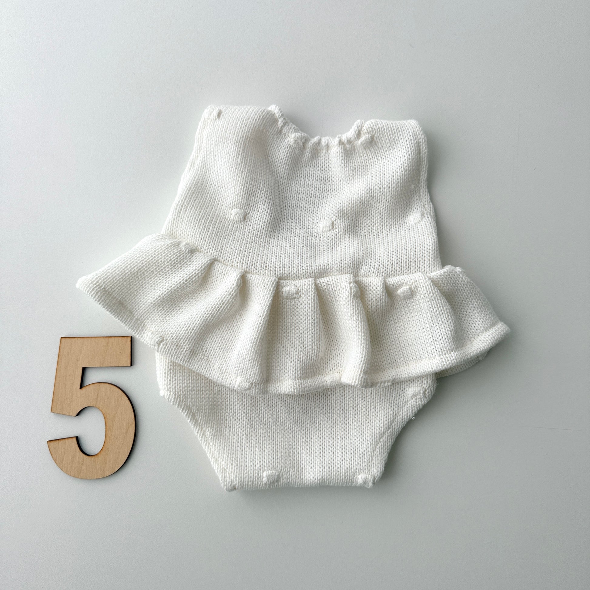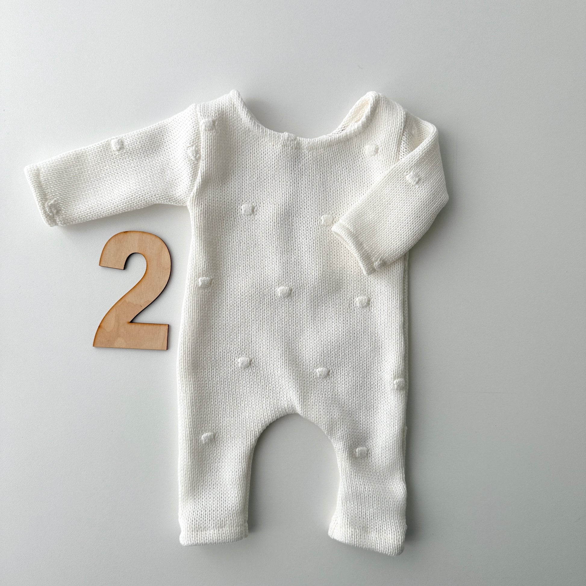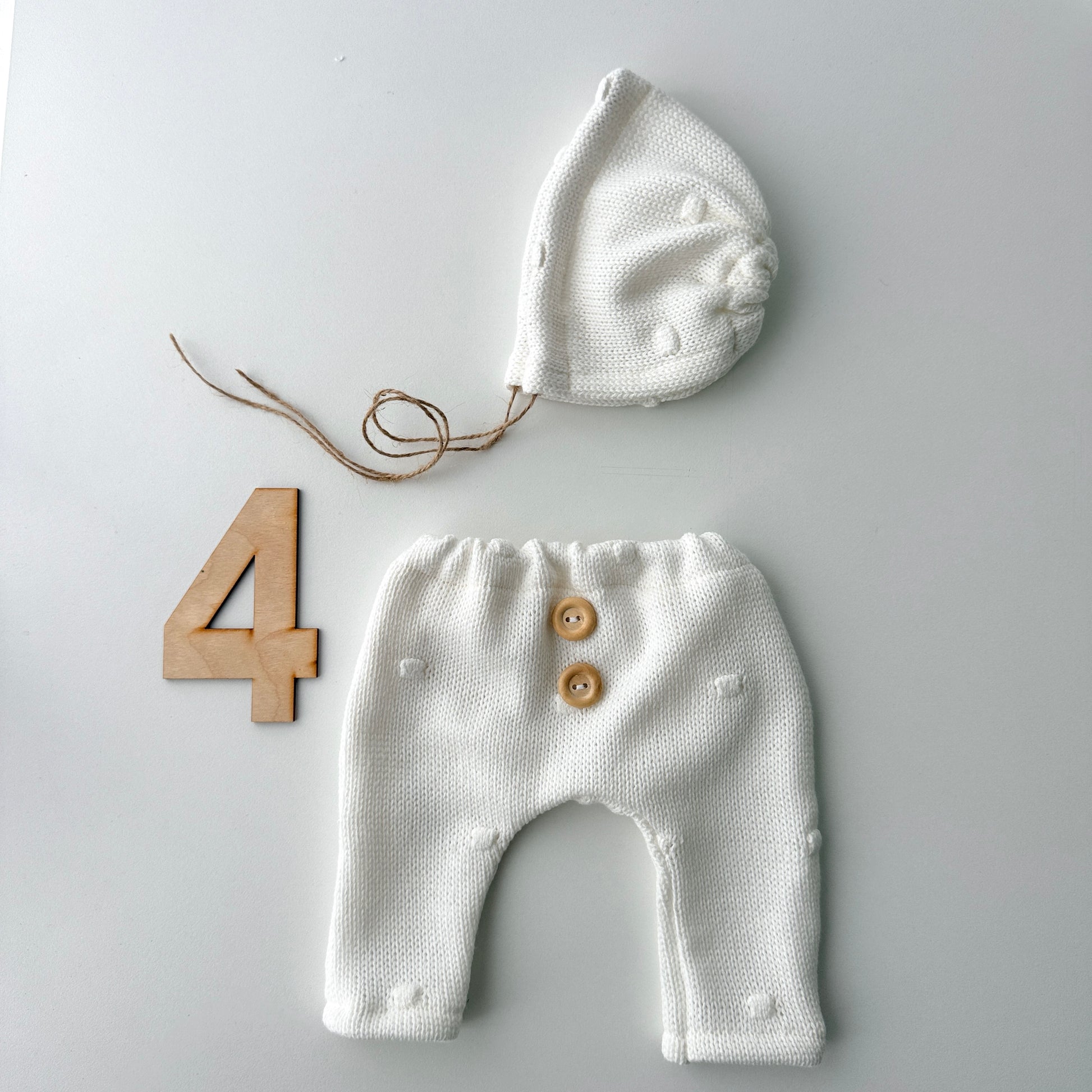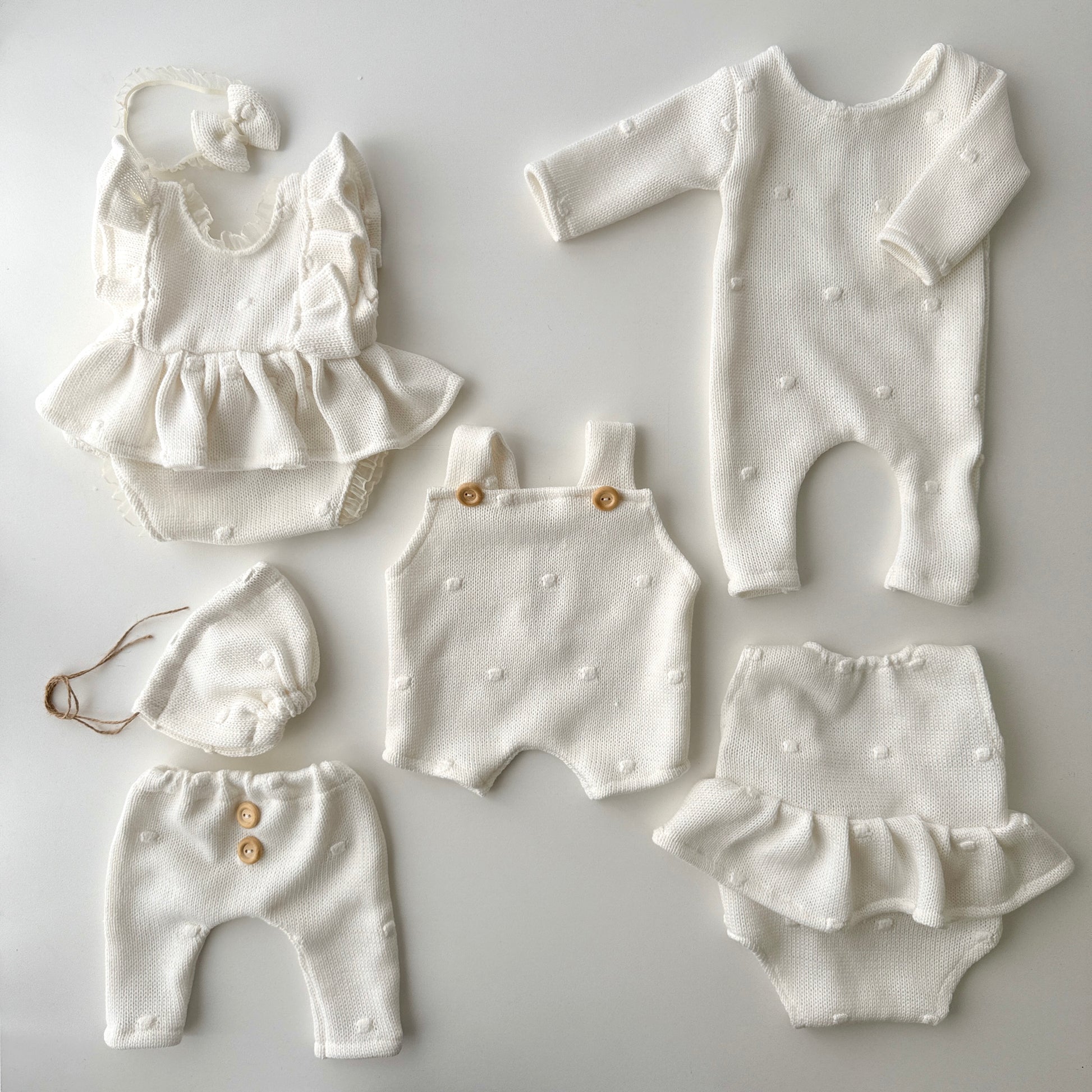 A timeless newborn clothing collection in a soft off white shade, designed for photography sessions and delicate newborn styling.