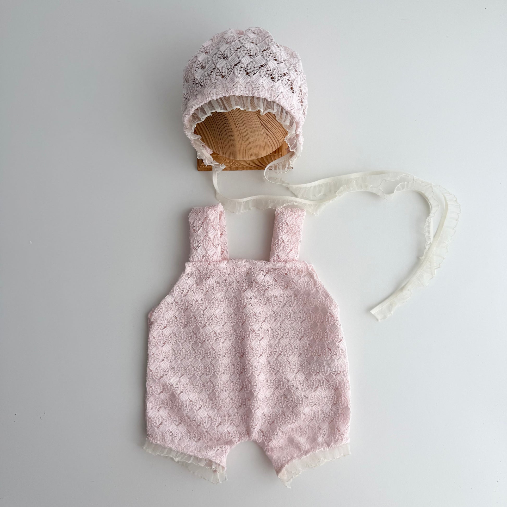 This beautiful piece features lace shorts designed to give the illusion of suspenders. The decorative faux suspender straps add a charming vintage touch while keeping the look soft and elegant. The entire set is crafted from soft pink lace (100% polyester) that photographs beautifully and drapes gently on the baby.