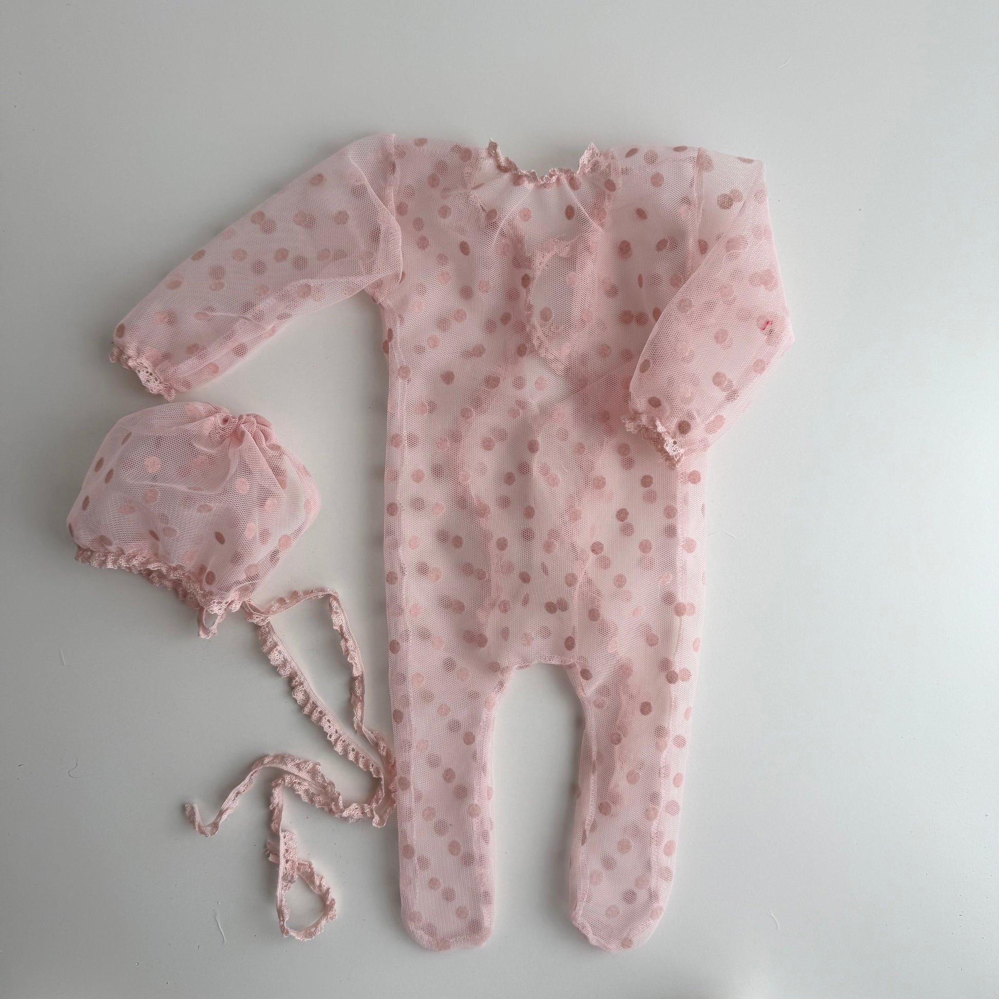 Roselle is a two-piece newborn photo prop set consisting of a full-length tulle romper and a matching newborn bonnet. The lightweight, sheer tulle fabric with subtle polka dots creates an airy, dreamy and elegant look, perfect for soft and feminine newborn portraits.