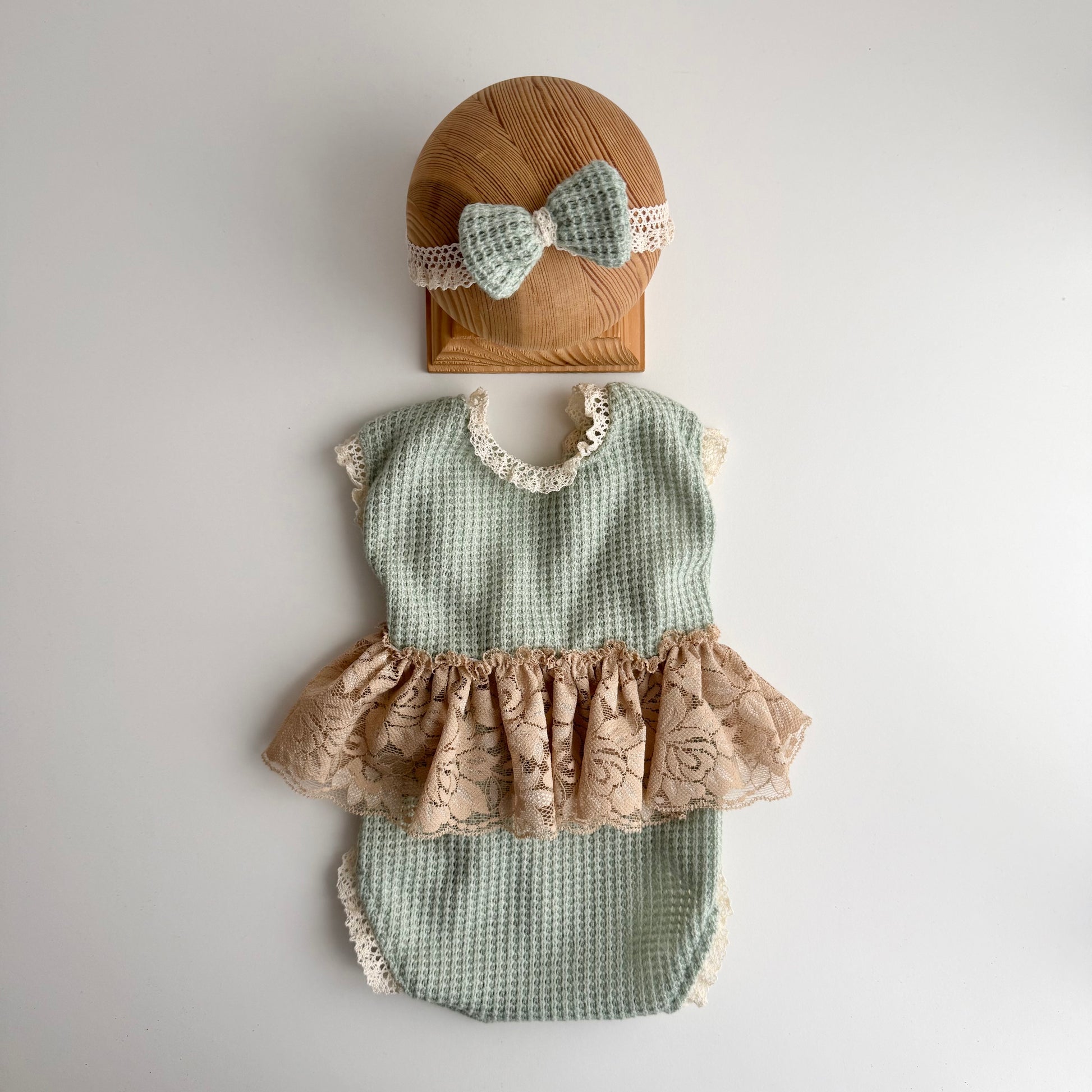 The textured sage green fabric creates a natural, organic base that photographs beautifully in both bright and moody setups. The delicate lace ruffle in warm beige adds vintage charm and subtle elegance, giving depth and movement to every image.